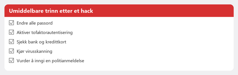 Men panikk hjelper ikke. Å handle raskt gjør det. Nedenfor finner du en trinn-for-trinn-plan som fungerer, uavhengig av hva som ble hacket.