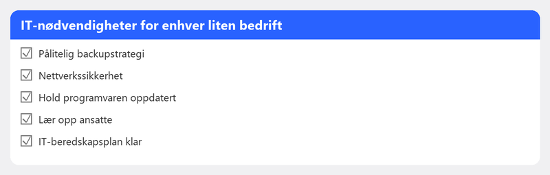 Du driver en bedrift med fem, ti, tjue ansatte. Alle jobber på en bærbar PC, alt er i skyen (eller burde være det), og når internett går ned, stopper hele kontoret. IT er ryggraden i virksomheten din, men du har ikke en fulltids IT-person i staben. Og ærlig talt, du vil ikke ha en heller. Du vil drive virksomheten din, ikke feilsøke.