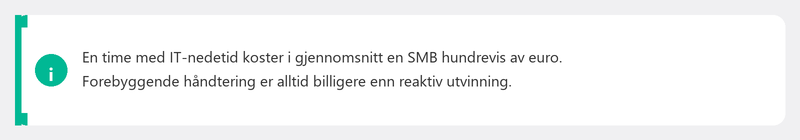 Gjør regnestykket. En dag med nedetid på grunn av et dataproblem koster allerede en bedrift med ti ansatte tusenvis av euro i tapt produktivitet. Et løsepenge-angrep kan koste uker med arbeid, pluss skade på omdømmet. Et databrudd som involverer klientdata kan resultere i en GDPR-bot. Og alt det mens ekstern IT-administrasjon koster mindre enn ett kaffemaskinabonnement.