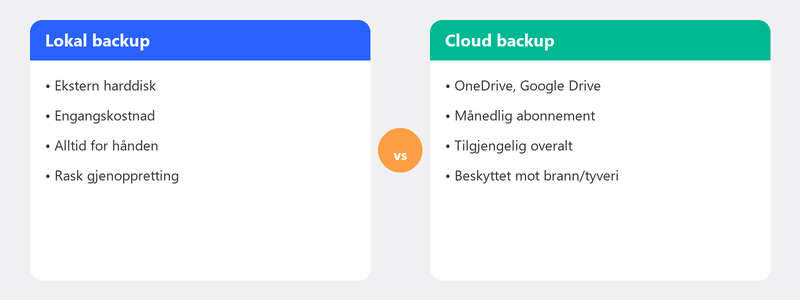 Cloud backup er det enkleste alternativet for de fleste. OneDrive (innebygd i Windows) eller Google Drive synkroniserer automatisk mappene dine til servere på internett. Filene dine er tilgjengelige fra alle enheter og beskyttet mot lokale katastrofer.