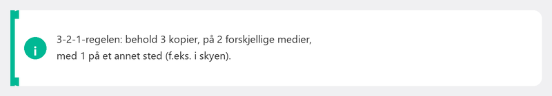Profesjonelle bruker 3-2-1-regelen: oppbevar tre kopier av filene dine (originalen pluss to sikkerhetskopier), på to forskjellige typer medier, med minst én på et annet sted (for eksempel i skyen). Dette beskytter deg mot praktisk talt alle scenarier.