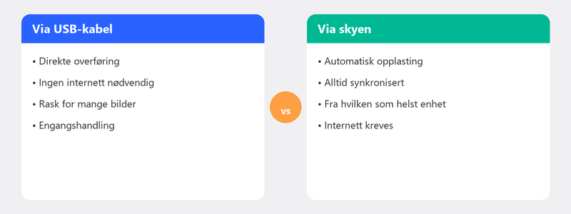Skylagring er den enkleste måten å automatisk holde bildene dine trygge på. Google Foto (Android), iCloud (iPhone) og OneDrive (Windows) synkroniserer bildene dine automatisk hvis du konfigurerer det. Fordelen: du trenger ikke tenke på det, og bildene dine er tilgjengelige fra alle enheter.