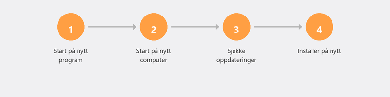 Denne artikkelen gir deg seks trinn som gjelder praktisk talt alle programmer. For spesifikke problemer med Outlook, les artikkelen vår om Outlook-problemer. For Office-problemer: Office-installasjon og feilsøking.