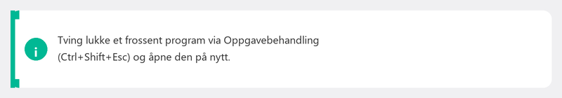 Programmet er frosset: det utfører ikke lenger instruksjoner og svarer ikke på klikk. Dette kan være forårsaket av en feil i programmet, utilstrekkelig minne eller en konflikt med annen programvare. Lukk den via Task Manager og åpne den på nytt.
