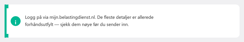 Gå til nettsiden til den nederlandske skattemyndigheten og klikk på Logg på og deretter på Min skattemyndighet. Du blir omdirigert til DigiD. Logg inn med brukernavn og passord, pluss SMS-koden eller DigiD-appen. Etter pålogging vil du se din forhåndsutfylte oppgave: Skatteetaten har allerede fylt ut mye informasjon for deg basert på data fra arbeidsgivere, banker og forsikringsselskaper.