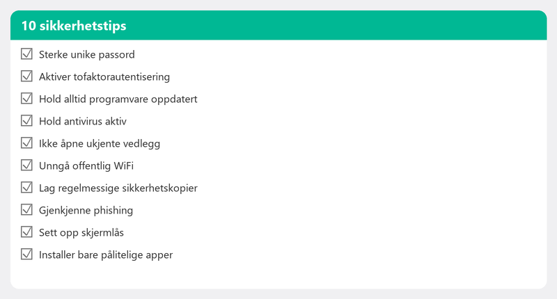 Ikke glem dine mobile enheter. Sett opp en skjermlås (PIN-kode, fingeravtrykk eller ansiktsgjenkjenning). Hold apper og operativsystemet oppdatert. Vær kritisk til apptillatelser: en lommelyktapp trenger ikke tilgang til kontaktene dine.