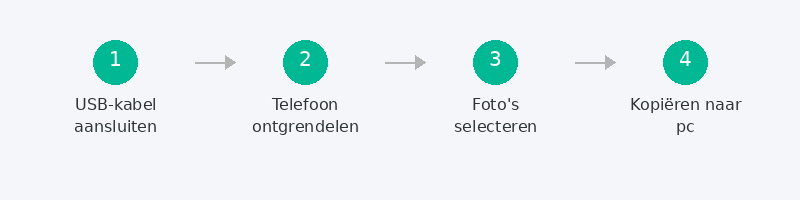 Sluit je telefoon aan op je computer met een USB-kabel. Je telefoon vraagt mogelijk om toestemming: kies Bestanden overdragen (of MTP). Open Verkenner op je computer en je ziet je telefoon als een apparaat. Navigeer naar de map DCIM (daar staan je foto's). Selecteer de foto's die je wilt overzetten en kopieer ze naar een map op je computer.