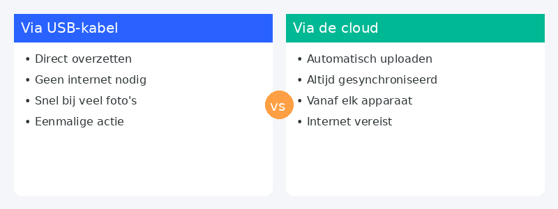 Via cloud-diensten: Google Foto's (Android), iCloud (iPhone), of OneDrive. Schakel automatische backup in op je telefoon en de foto's verschijnen vanzelf op je computer als je bent ingelogd met hetzelfde account.