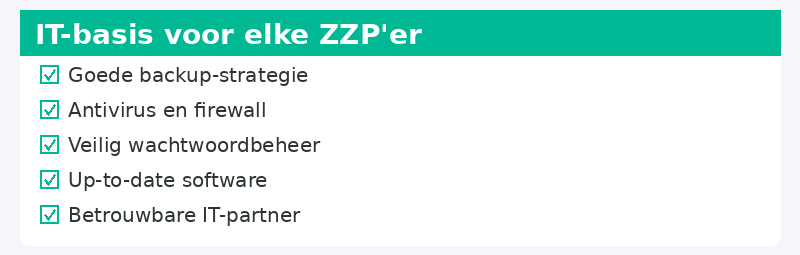 Als ZZP'er ben je je eigen directeur, boekhouder, marketeer en IT-afdeling tegelijk. Dat gaat prima, tot je laptop crasht op de dag van een deadline. Of tot je ontdekt dat je geen backup hebt van je k...