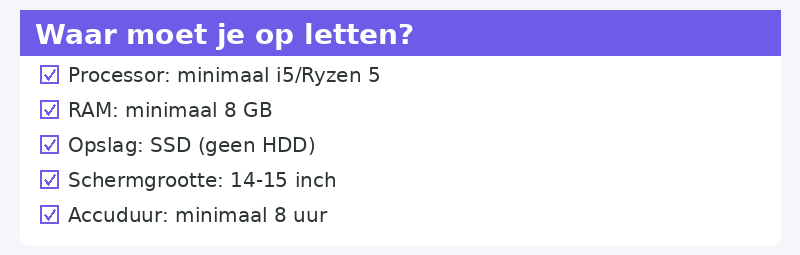 - Overweeg een refurbished laptop: professioneel opgeknapt, 30–50% goedkoper dan nieuw, met garantie.