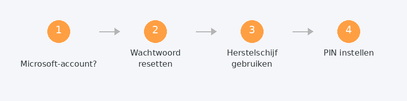 Als je een lokaal account hebt zonder gekoppeld e-mailadres, ben je aangewezen op beveiligingsvragen, een ander beheerdersaccount, of een herstelstation. Koppel na het resetten alsnog een e-mailadres voor de toekomst.