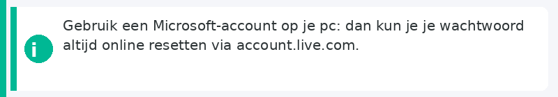 Gebruik een wachtwoordmanager. Programma’s als Bitwarden of 1Password slaan al je wachtwoorden veilig op, zodat je ze niet hoeft te onthouden. Stel daarnaast een PIN in als extra aanmeldoptie in Windows (Instellingen, Accounts, Aanmeldingsopties). En als je een lokaal account gebruikt: stel beveiligingsvragen in. Microsoft legt hier de aanmeldingsopties uit.