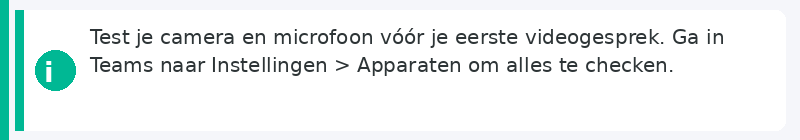 - Camera en microfoon testen: Klik op het tandwiel-icoon (instellingen), ga naar Audio en Video, spreek een testzin in en controleer of je jezelf in beeld ziet.