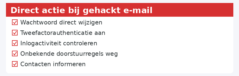 Duidelijke signalen zijn: je kunt niet meer inloggen terwijl je wachtwoord niet is gewijzigd door jou, contacten ontvangen mails die je niet hebt verstuurd, of je ziet onbekende aanmeldactiviteit in je beveiligingsinstellingen. Check ook je emailadres op haveibeenpwned.com om te zien of het is gelekt bij een datalek.
