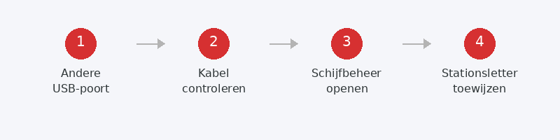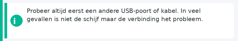 Meest voorkomende oorzaken: slechte USB-kabel of poort, verouderde driver, stroomgebrek (bij schijven zonder eigen voeding), of een beschadigde partitietabel. In dat laatste geval is de data er vaak nog wel.