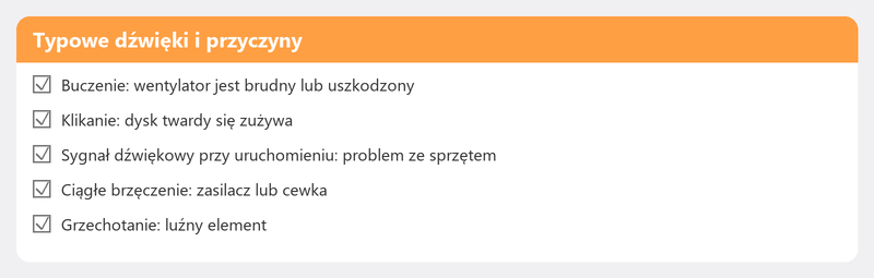 Z dźwiękami tykania lub klikania (dysk twardy), ciągłym sygnałem dźwiękowym podczas uruchamiania (awaria sprzętu) lub grzechotaniem, którego wcześniej nie słyszałeś. Zawsze zaczynaj od kopii zapasowej.