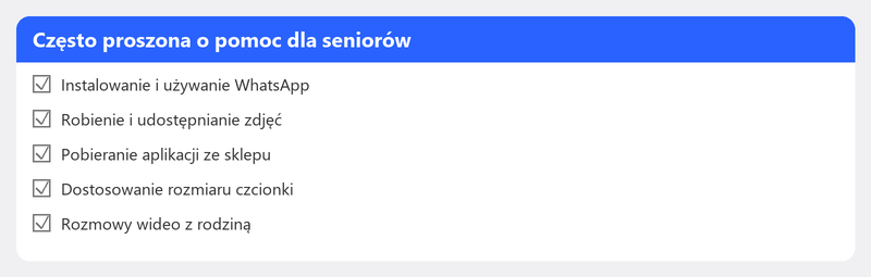 Smartfon lub tablet może uczynić Twoje życie przyjemniejszym. Utrzymuj kontakt z dziećmi i wnukami poprzez rozmowy wideo, udostępniaj zdjęcia w aplikacji rodzinnej lub po prostu czytaj wiadomości na większym ekranie. Jednak konfiguracja i używanie takiego urządzenia nie zawsze jest proste. To w porządku. Chętnie Ci pomożemy, spokojnie i w Twoim własnym tempie.
