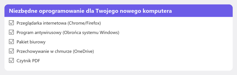 Nowy komputer ma tylko podstawowe programy. Pomyśl o: przeglądarce (Chrome, Firefox lub Edge), pakiecie Microsoft Office lub bezpłatnej alternatywie, oprogramowaniu antywirusowym (domyślnie Windows Defender jest już aktywny), Zoomie lub Teams, jeśli prowadzisz rozmowy wideo, oraz wszelkich programach przydatnych w Twoim hobby lub pracy.