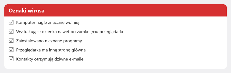 Nie każdy problem jest wirusem, ale istnieją wyraźne sygnały ostrzegawcze. Twój komputer nagle stał się znacznie wolniejszy. Wyskakujące okienka pojawiają się nawet wtedy, gdy przeglądarka jest zamknięta. Widzisz programy, których nie rozpoznajesz. Twoja przeglądarka ma inną stronę główną. Kontakty otrzymują dziwne e-maile z Twojego adresu. Jeśli rozpoznajesz jeden lub więcej z tych objawów, czas podjąć działania.