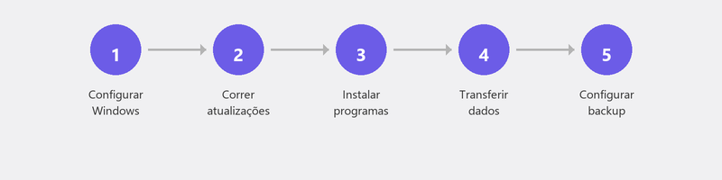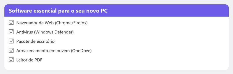 Um novo computador possui apenas os programas básicos. Pense em: um navegador (Chrome, Firefox ou Edge), Microsoft Office ou uma alternativa gratuita, software antivírus (o Windows Defender já está ativo por padrão), Zoom ou Teams se você fizer videochamadas e quaisquer programas para seu hobby ou trabalho.