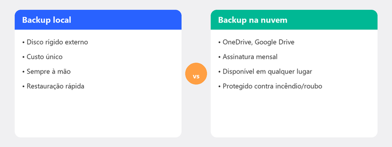 O backup na nuvem é a opção mais fácil para a maioria das pessoas. OneDrive (integrado ao Windows) ou Google Drive sincroniza automaticamente suas pastas com servidores na Internet. Seus arquivos podem ser acessados de qualquer dispositivo e protegidos contra desastres locais.