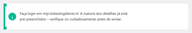 Acesse o site da Autoridade Tributária Holandesa e clique em Login e depois em Minha Autoridade Tributária. Você será redirecionado para DigiD. Faça login com seu nome de usuário e senha, além do código SMS ou aplicativo DigiD. Depois de fazer login, você verá sua declaração pré-preenchida: a Autoridade Tributária já preencheu muitas informações para você com base em dados de empregadores, bancos e seguradoras.