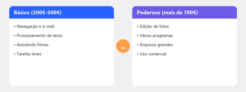 - 400-800 euros: O ponto ideal para a maioria das pessoas. Processador i5 confiável, 16 GB de RAM e SSD de 512 GB.
