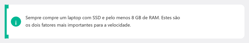 - Armazenamento (SSD). Os laptops modernos possuem um SSD. 256 GB é pequeno, mas viável. 512 GB é confortável. 1 TB se você armazena muitas fotos, vídeos ou jogos.