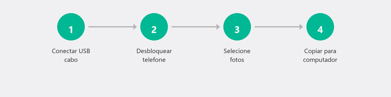 Conecte seu telefone ao computador com um cabo USB. Seu telefone pode pedir permissão: escolha Transferência de arquivos (ou MTP). Abra o File Explorer no seu computador e você verá seu telefone como um dispositivo. Navegue até a pasta DCIM (é onde estão suas fotos). Selecione as fotos que deseja transferir e copie-as para uma pasta no seu computador.