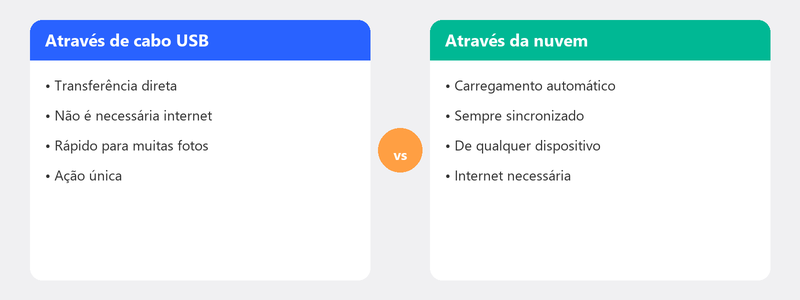 Via serviços em nuvem: Google Fotos (Android), iCloud (iPhone) ou OneDrive. Ative o backup automático em seu telefone e as fotos aparecerão automaticamente em seu computador quando você estiver conectado com a mesma conta.