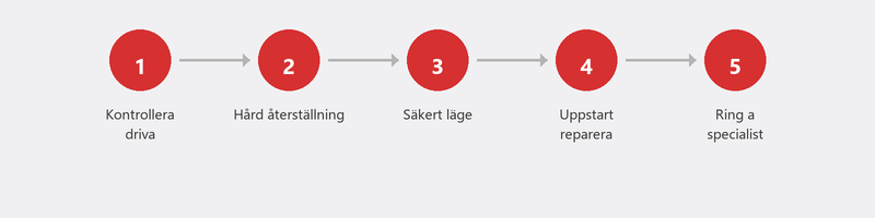 Om din dator kommer till återställningsmenyn eller felsäkert läge kan vi hjälpa dig på distans. Vi guidar dig genom återställningsstegen via telefon, eller skapar en anslutning när Windows körs i felsäkert läge. Ring oss så bedömer vi omedelbart om vi kan hjälpa till på distans eller om det är ett hårdvaruproblem som kräver en reparationsverkstad.