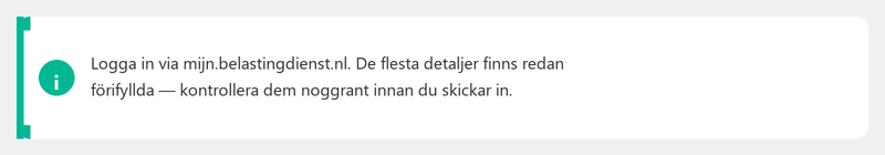 Gå till den nederländska skattemyndighetens webbplats och klicka på Logga in och sedan på Min skattemyndighet. Du kommer att omdirigeras till DigiD. Logga in med ditt användarnamn och lösenord, plus SMS-koden eller DigiD-appen. Efter att ha loggat in ser du din förifyllda deklaration: Skatteverket har redan fyllt i en hel del information till dig baserat på uppgifter från arbetsgivare, banker och försäkringsbolag.