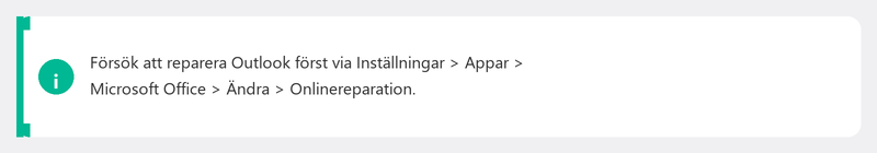 Om Outlook ständigt kraschar eller ger felmeddelanden, försök att reparera Office. Gå till Inställningar, Appar, Installerade appar, hitta Microsoft 365 eller Microsoft Office, klicka på de tre prickarna och välj Ändra. Välj Online Repair (inte Quick Repair, eftersom det är mindre noggrant). Detta ominstallerar alla Office-filer utan att ta bort dina data.