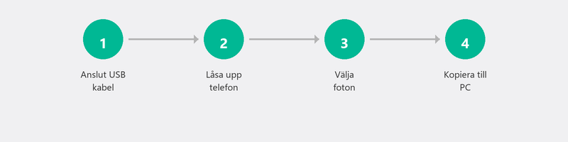 Anslut din telefon till din dator med en USB-kabel. Din telefon kan be om tillåtelse: välj Filöverföring (eller MTP). Öppna File Explorer på din dator så ser du din telefon som en enhet. Navigera till DCIM-mappen (det är där dina foton finns). Välj de foton du vill överföra och kopiera dem till en mapp på din dator.