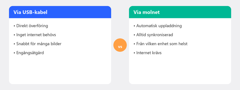 Via molntjänster: Google Photos (Android), iCloud (iPhone) eller OneDrive. Aktivera automatisk säkerhetskopiering på din telefon så visas bilderna på din dator automatiskt när du är inloggad med samma konto.