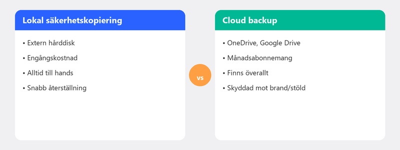 Cloud backup är det enklaste alternativet för de flesta. OneDrive (inbyggt i Windows) eller Google Drive synkroniserar automatiskt dina mappar till servrar på internet. Dina filer är tillgängliga från alla enheter och skyddade mot lokala katastrofer.