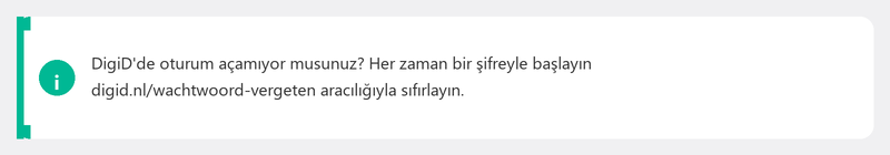 Çok sayıda başarısız giriş denemesinden sonra DigiD'niz geçici olarak engellenir. Bir saat bekleyip tekrar deneyin. Hala içeri giremiyor musun? digid.nl adresinden yeni bir şifre isteyin. Hesabınız bozulmadan kalır; yalnızca şifre sıfırlanır.