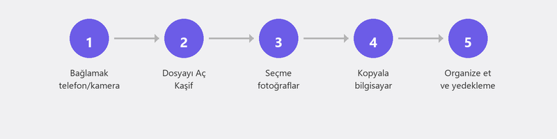 Telefonunuzu USB kablosuyla bilgisayarınıza bağlayın. Telefonunuz izin isteyebilir: Dosya aktarımını (veya MTP'yi) seçin. Bilgisayarınızda Dosya Gezgini'ni açtığınızda telefonunuzu bir cihaz olarak göreceksiniz. DCIM klasörüne gidin (fotoğraflarınızın bulunduğu yer burasıdır). Aktarmak istediğiniz fotoğrafları seçin ve bilgisayarınızdaki bir klasöre kopyalayın.