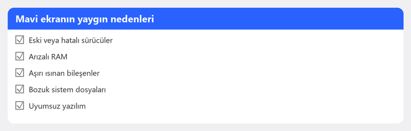 Mavi ekranın çeşitli nedenleri olabilir. En yaygın olanları sürücü sorunları (Windows ile iyi çalışmayan bir sürücü), bir şeyi bozan yeni bir Windows güncellemesi, hatalı bellek (RAM), işlemcinin aşırı ısınması veya nadir durumlarda kötü amaçlı yazılımlardır. Sorun genellikle bir güncellemeden veya yeni donanım veya yazılım yüklendikten kısa bir süre sonra ortaya çıkar.